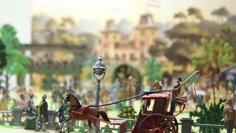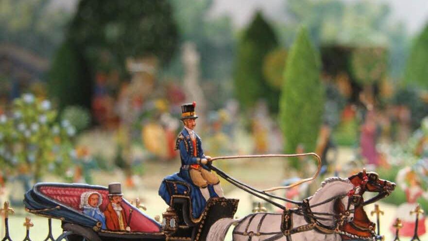 Eine Pferdekutsche fährt vor dem Lustgarten vor und hält an. Auf dem Kutschbock sitzt ein freundlich lächelnder Kutscher, herrschaftlich ausgestattet mit leuchtend blauem Mantel, mit Knickerbocker-Hose und roten Wams. Auf dem Kopf prangt ein steifer Zylinder. Im Inneren der Kutsche sitzt das herrschaftliche Ehepaar: Jedes kleine Detail, der nur wenige Zentimeter großen Figur ist ausgearbeitet - sogar hauchzarte Rüschen an der Kopfbedeckung der Frau. Die Nieten, mit denen die Kutsche verziert ist, die Polsterung der Kutsche ist mit Schatten gemalt. Und sogar die Gesichter der Menschen sind liebevoll bis ins kleinste Detail dreidimensional gestaltet.