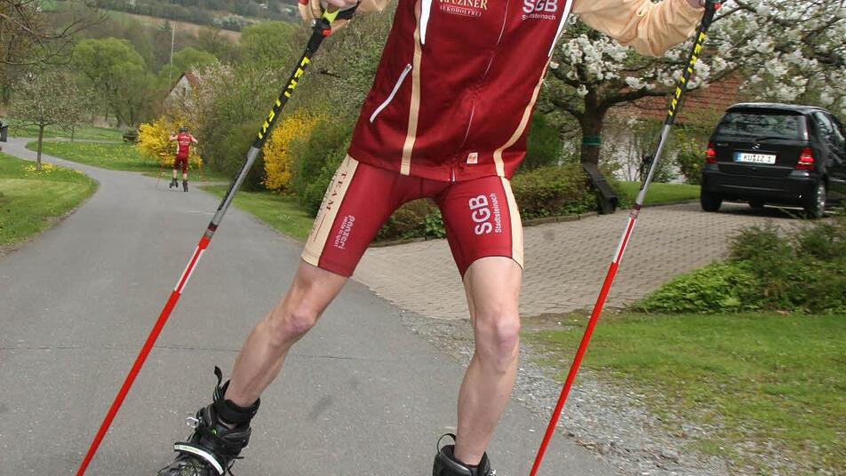 Gemütlich und entspannt schnallt Oliver Hempfling, Vorsitzender der SG Biathlon Stadtsteinach, auf einem Bänkchen unweit seines Wohnhauses in Ebersbach die nagelneuen Cross-Skates an. "Ich hatte sie schon mal an den Füßen und möchte einfach mal testen, wie man mit ihnen trainieren kann", sagt der 41-Jährige.