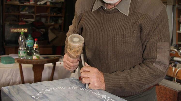 Sehr oft werden die Steine mit Bibelversen verziert. "Manche Menschen kommen schon mit sehr genauen Vorstellungen. Dann muss man schauen, wie man die technische Ausführung hinbekommt", erzählt Peter Krüger. Derzeit haut sein Vater Erich Krüger ein Jesus-Antlitz in einen Grabstein. "Sandstein kann man sehr fein behauen. Auf Granit wird es immer gröber", erklärt der Experte. Völlig "out" ist Kunststein, sagt der 77-jährige Vater, ist aber eigentlich ganz froh darüber.