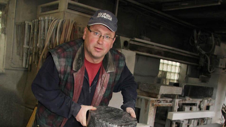 Sein Vater Erich Krüger setzt indessen sein Werkzeug an einen himmelblauen Stein an: es ist ein azurblauer "Azul de Macaubas" aus Brasilien. Ein sehr seltener Stein. Denn meistens werden grünliche Gesteine, Grautöne oder eben Rotttöne verwendet. Gerne auch in Kombination. "Der Trend geht zu Urnengräbern und zu kleineren Steinen."