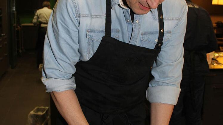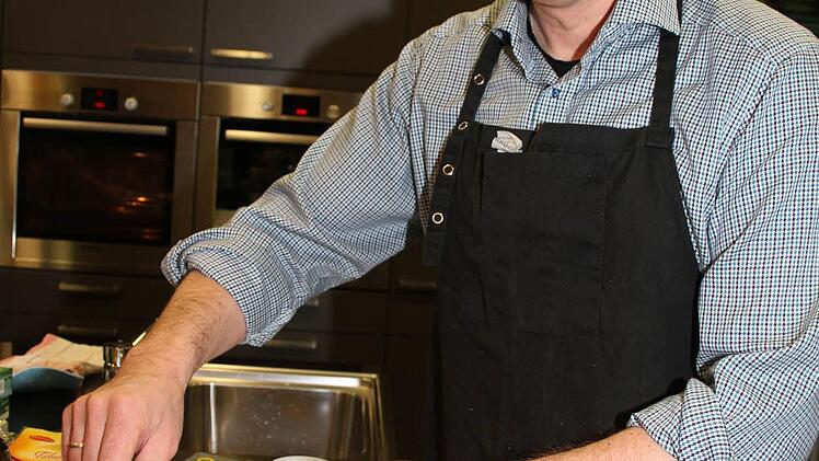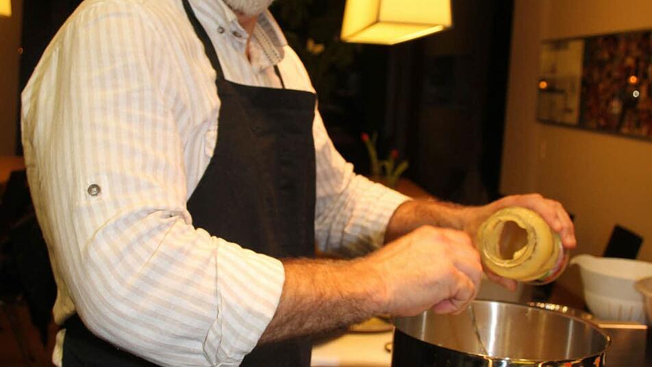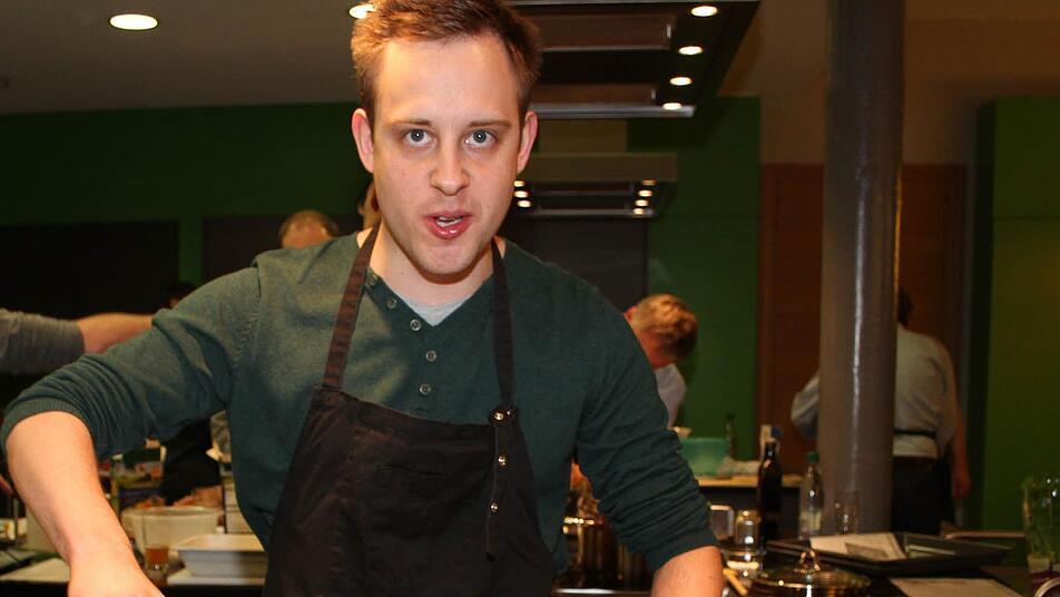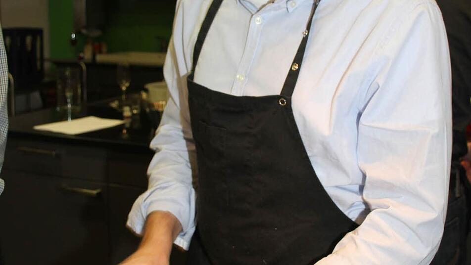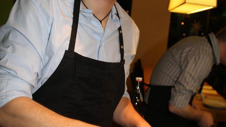 "Mehr als 350 Kilometer Anreise? Das ist aber weit, um Salat zu waschen", unkte indes der Mann, der sich den zweiten Gang ausgesucht hatte: Christian Riedinger, 49 Jahre alt aus Schwarzach. Er sollte "Adams Verführung" vorbereiten. Hinter diesem blumigen Namen verbirgt sich eigentlich nur eine Kartoffelsuppe, allerdings wurde die mit Apfelmus, Creme fraiche, reichlich Sahne und Forellenfilet verfeinert.
