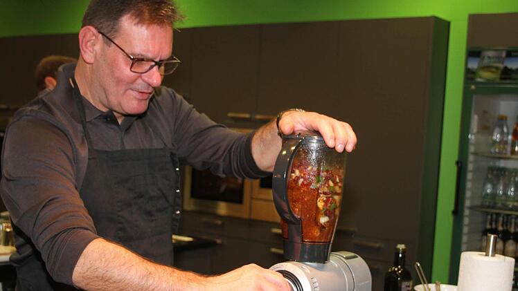 Denn die Mega-Menge brachte die Küchenmaschine, den Pürierstab zum Glühen. "Dabei koche ich auch zu Hause öfters mal. Wir verwöhnen unsere Frauen immer drei Mal im Jahr mit einem schönen Menü", erzählte Bernd Herold und kämpfte mit dem Pesto. Doch er gewann. Und auch an dieser Station gab es ein Happy-End.