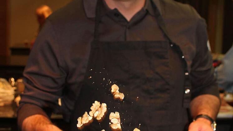Als Vorspeise stand eine Salatkreation mit Apfelscheibchen und überbackenem Ziegenkäse in verführerischer Honig-Balsamico-Sauce auf dem Programm. Michael Straub (47) wollte diese Station übernehmen. Er fackelte nicht lange - röstete Pinienkerne an.