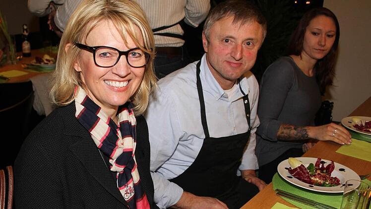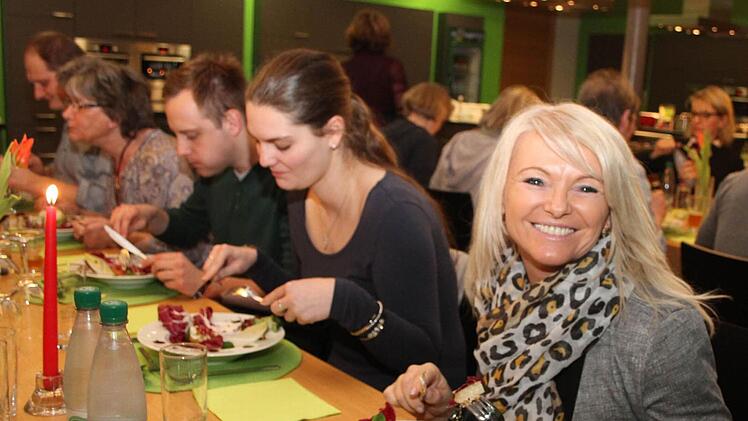 Natürlich war auch Fleisch beim Valentins-Menü dabei. Helmut Hohlweg (58) aus Rugendorf und Stefan Grasser (48) aus Huppendorf betreuten die Fleischstation. "Anfangs hat man den Valentinstag noch mehr gefeiert, nach dreißig Jahren lässt das ein bisschen nach. Aber ich vergesse den Tag nicht. Der Kochkurs ist bestimmt was Besonderes", sagte Helmut Hohlweg. "Mein Mann kocht auch zu Hause. Unsere neueste Errungenschaft ist ein Thermomix - guided cooking kann er echt gut. Er macht in der Maschine Reis, Fisch, Hack.