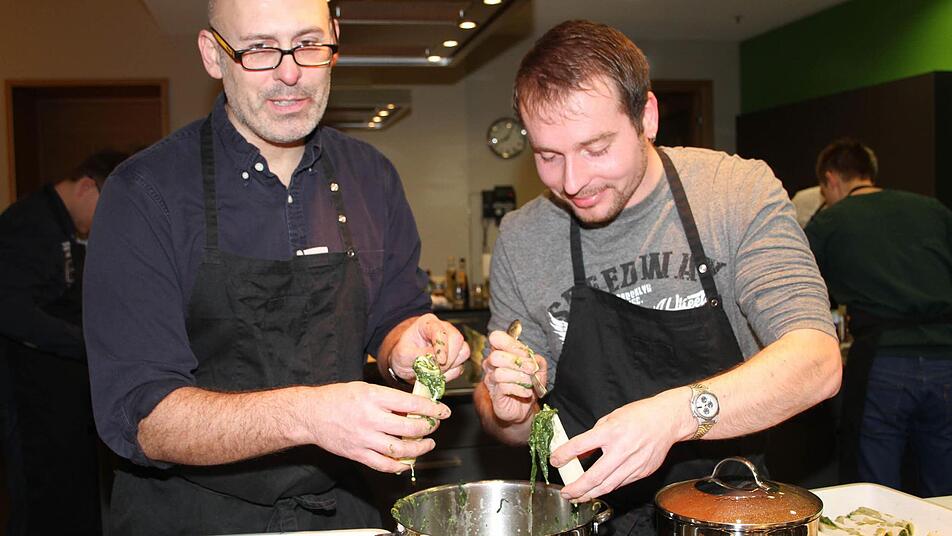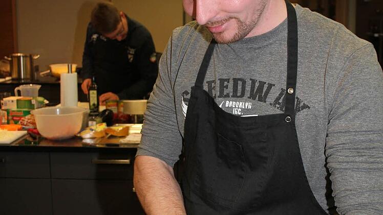 Stefan Grasser hat den Kochgutschein von den Kindern geschenkt bekommen. "Offenbar ist das Essen verbesserungswürdig", unkte er. Doch gemeinsam mit dem Rugendorfer Kollegen rollten die beiden Mäner die Röllchen, die schon eher ausgewachsene Roladen waren. "Das funktioniert - wir können jetzt mal 500 Stück machen", hatten auch diese beiden Männer Spaß. Gegart wurden Fleischrollen übrigens in Alufolie-Bonbons im Backofen.