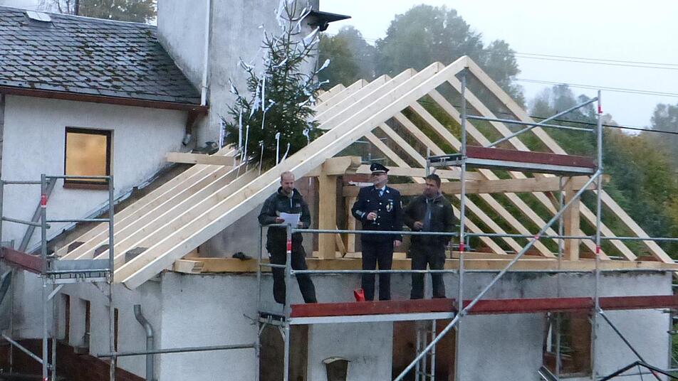 Das günstigste Angebot für den Wiederaufbau gab die Firma Lösch aus Thiersheim ab, der der Gemeinderat auch einstimmig den Auftrag erteilte. In den vergangenen Wochen wurde auf der Baustelle fleißig gearbeitet, und jetzt konnte Richtfest gefeiert werden.