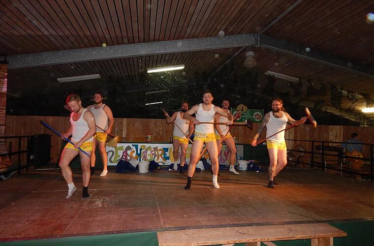 Ein weiterer Höhepunkt um Mitternacht, als sechs sexy Jungs den Besentiel-Tanz kreierten. Die Damen erzwangen eine Zugabe. Schön auch die Pantomime des männlichen Faschingsfreunde-Team. Unter dem Motto "Löschzug" wurden originelle Schattenbilder auf eine Leinwand geworfen.
