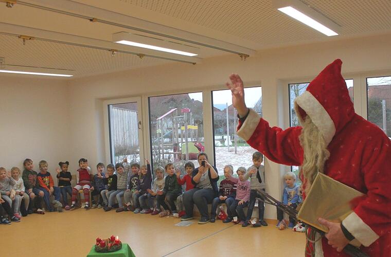 Drei Kindergartengruppen mit 71 Buben und Mädchen begrüßten den Mann mit dem roten Mantel und der tiefen Stimme mit dem Lied "Seid still". Der bärtige Geselle freute sich über das Willkommen.
