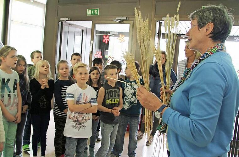 Mit den Dritt- und Viertklässlern der Neuenmarkter Schule erkundete die Expertin die Welt des Getreides.