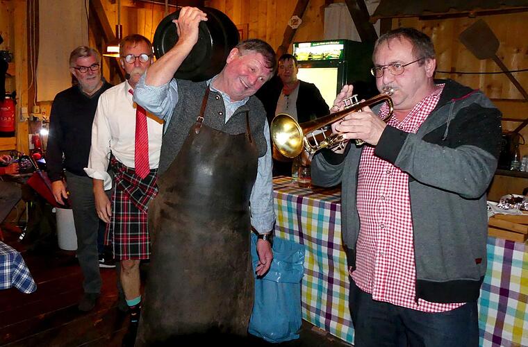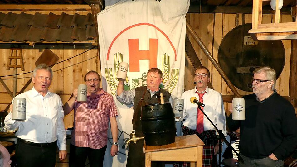 Dann rief er aus, worauf die Besucher des "23. Böckschießens" im vollbesetzten Haberstumpg-Bräustadl Haberstumpf schon sehnsüchtig warteten: "O"gstochn is". Das klang zwar allemal fränkischer, als das altbayerische "O"zapft is". Brachte aber - zumindest bei den Gästen, die keinen direkten Blickkontakt zum Ort des Geschehens hatten - nicht ganz deutlich zum Ausdruck, ob damit nicht irgendein Stück Vieh gemeint war (der Bürgermeister kommt aus der Landwirtschaft), das er gerade erlegt hatte und das jetzt vielleicht vom Team des Tennisclubs für den Verzehr zubereitet worden wäre. Nein, Trebgasts Oberhaupt hatte es auf Anhieb geschafft, den neuen Hopfen-Doppelbocks für den sofortigen Verbrauch an Ort und Stelle vorzubereiten. Damit war die Bockbiersaison in Trebgast eröffnet. Dieses Ereignis wurde natürlich gleich ausgiebig gefeiert.