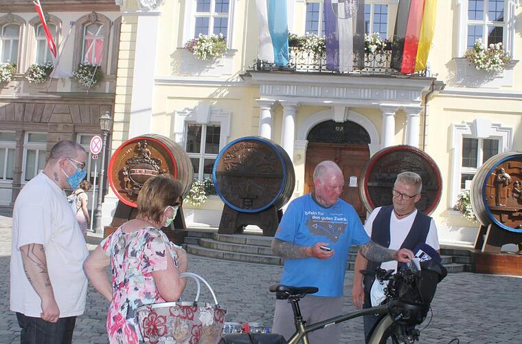 Nach Kulmbach radelte er von Bamberg aus; morgens um 10 Uhr war er dort gestartet, kurz nach 16 Uhr traf er am Kulmbacher Rathaus ein. Bürgermeister Frank Wilzok hieß den Ausnahme-Radler herzlich willkommen und überreichte ihm ein großes Handtuch mit Stadtwappen. "Wir freuen uns, dass Oli in Kulmbach Station macht und wir unterstützen die gute Sache natürlich gern", sagte Wilzok und zollte dem Radler größten Respekt für seine Leistung.