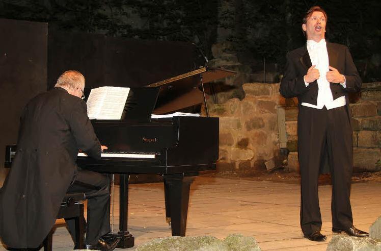 An die Grenzen seiner Leistungsfähigkeit kam das Opernstudio bei der Aufführung von Giuseppe Verdis "Don Carlo". Das Duett zwischen Don Carlos (Karl Schineis) und Rodrigo (Michael Wolfrum gelang noch bestens. Doch dann verwehte der Wind die Noten von Pianist Klaus D. Jung, der sich ohnehin schon mitsamt seinem Instrument in den Zuschauerraum geflüchtet hatte. Das Wetter wurde so schlimm, dass ein Abbruch der Vorstellung fast unumgänglich schien. Denn immer wieder flogen die Noten davon.