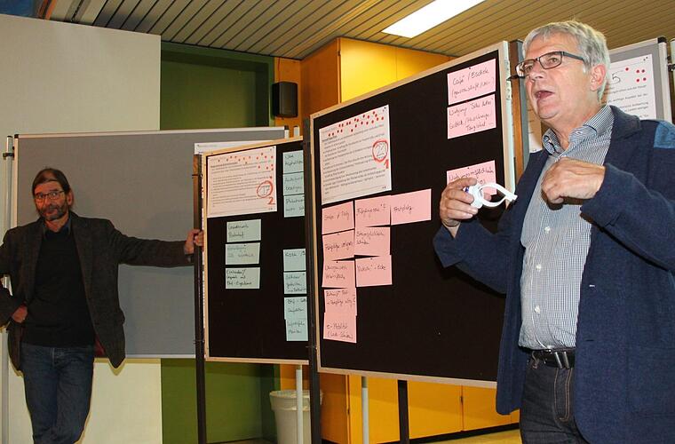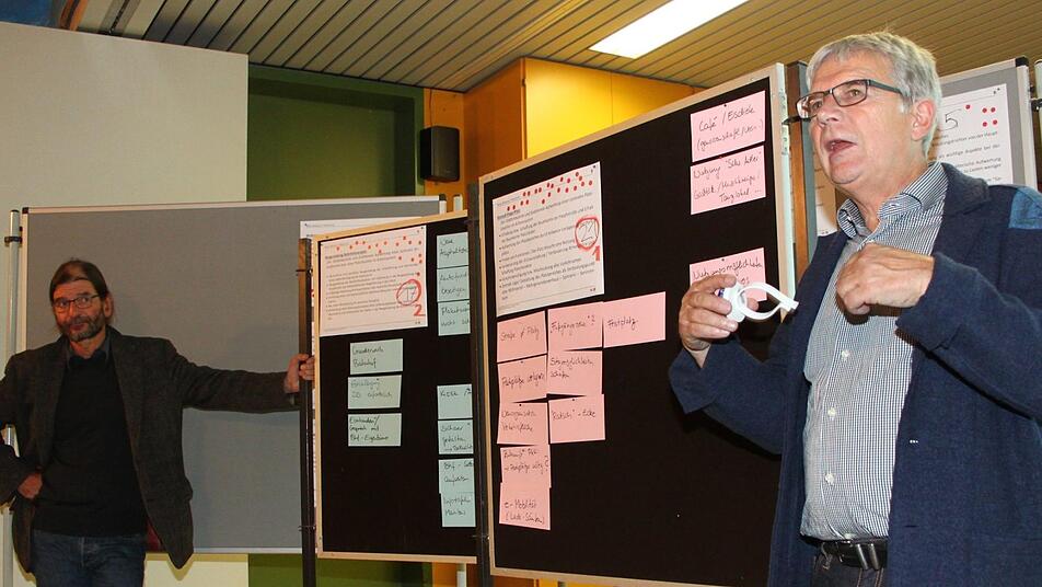 In der Aula der Mittelschule diskutierten rund 30 Besucher mit den beiden Städtebau-Experten Leonhard Valier (Büro für Städtebau und Bauleitplanung in Bamberg) und Gunter Schramm (Büro Planwerk aus Nürnberg). Das zweieinhalbstündige Treffen stand unter dem Motto "Bürgerworkshop Zukunft Mainleus".