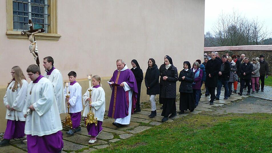 "Viele Gläubige haben sich auf den Weg gemacht und sind heute aus nah sowie fern in unseren Marienwallfahrtsort gekommen, um dabei zu sein", freute sich der Geistliche mit Blick in die gut gefüllte Basilika. Er forderte sie auf, an der kleinen Prozession teilzunehmen, die aus dem Haupteingang hinaus, oben um die Kirche herum zur Öffnung der geschmückten ,Pforte der Barmherzigkeit' am Südportal führte. Nahezu alle Gläubige schlossen sich an, wobei der Nieselregen keinen störte. Pater Adrian rief alle Christen auf, in ihrem täglichen Leben Barmherzigkeit zu pflegen und barmherzig zu handeln, um diese in der ganzen Weltkirche zu vertiefen.