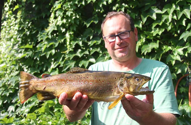 Peter Krüger hat noch eine andere Bachforelle mit seiner Fliegenfischtechnik an Land gezogen, allerdings ist die etwas kleiner.