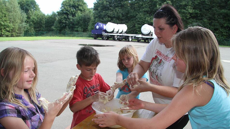 Unterdessen knetete Uschi Prawitz mit den Kindern der Juniorakademie einen Pizzateig aus Hefe, Wasser, Öl und Mehl von der Stadtsteinacher Partheimühle. Anna Günther (11) und Jasmin Prawitz (11) schnitten Salami klein. Sophie Eberhardt (10) säuberte die Pilze mit einem Backpinsel.