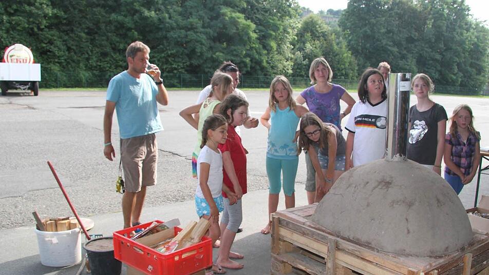 "Schön aufschichten", gab Oliver Leimenstoll, der schon öfters solche Öfen gebaut hat, das Kommando. Und dann zündeten die Kinder das Holz an. Im Nu qualmte der eingearbeitete Schlot. Der Ofen konnte mit einer hölzernen Tür, ebenfalls selbst gebaut, fest verschlossen werden, so dass sich auch genügend Hitze im Inneren aufbauen konnte.