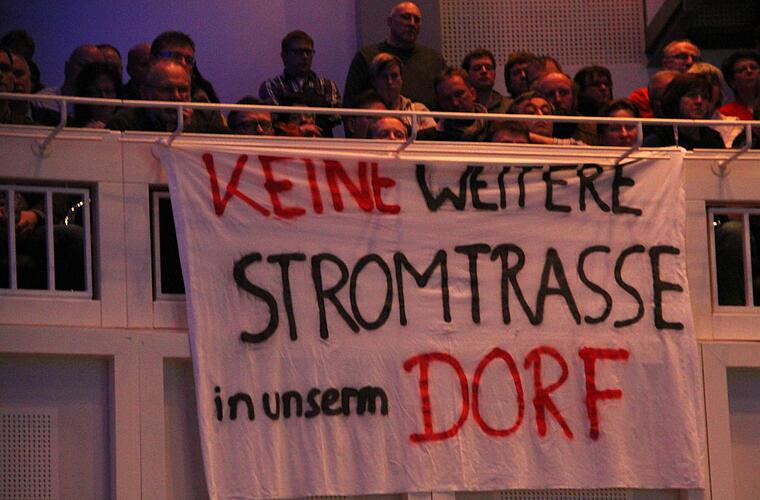 Als Projektleiter Dirk Uther von der Firma Amprion über die geplante Stromtrasse informieren wollte, wurde er immer wieder von Zwischenrufen unterbrochen ("Schläfern Sie uns nicht ein"; "Gehen Sie auf unsere Fragen ein!"). Und die Leute erreichten ihr Ziel: Uther brach seinen Vortrag ab, nachdem die "Schreihälse" (O-Ton Uther) keine Ruhe gaben. Die Diskussion konnte beginnen.