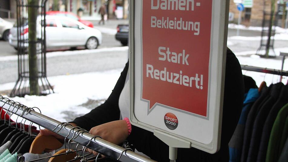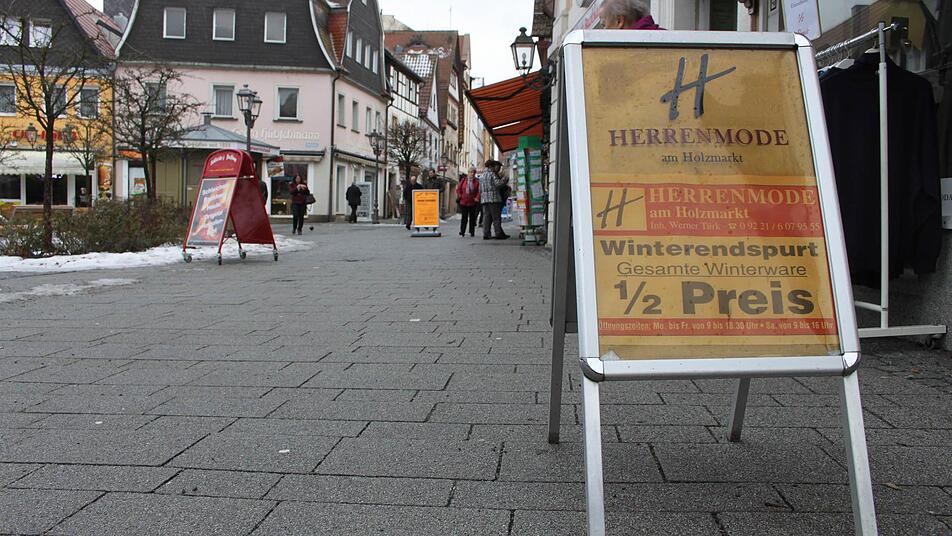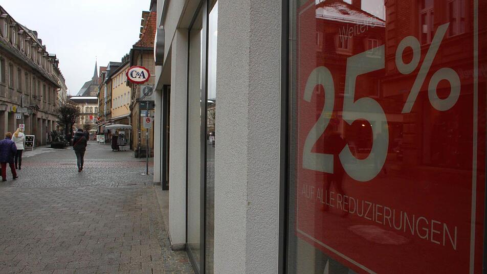 Sie sind kaum zu übersehen - neonfarbene Schilder und Plakate zieren in der Kulmbacher Fußgängerzone Wände, Schaufenster und Kleiderständer. Vereinzelt stöbern Kunden in Reihen mit den teilweise stark reduzierten Winterjacken, Mänteln und Schuhen vor den Geschäften. Von einem Massenansturm ist allerdings nichts zu sehen.
