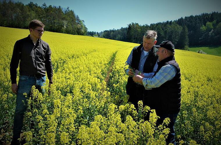 Gelb leuchtende Felder entlang von Straßen und Wegen weisen gegenwärtig darauf hin, dass der Raps in seiner vollen Blüte steht. Doch der Schein trügt: Die Rapsblüte braucht dringend Regen. Das wurde bei der Besichtigung eines Feldes auf dem Betrieb von Kulmbachs BBV-Kreisobmann Wilfried Löwinger deutlich. An dem Treffen nahm auch der Vorsitzende der Erzeugergemeinschaft für Qualitätsraps, Kronachs stellvertretender BBV-Kreisobmann Klaus Siegelin, teil. Begleitet wurde der Feldbesuch von einem Fernsehteam des Bayerischen Fernsehens.
