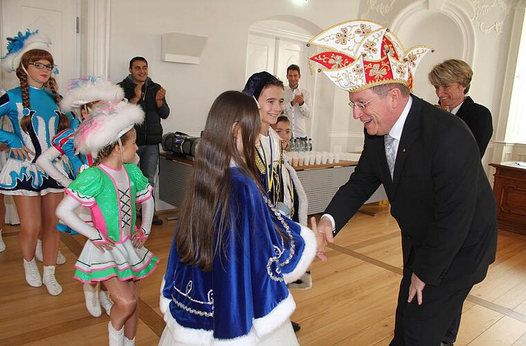Oberbürgermeister Henry Schramm freute sich über die "Light"-Version des Rathaussturmes. "Wenn so junge Narren kommen, war es für uns selbstverständlich, dass wir den Spaß mitmachen", so Schramm. Und natürlich gab es auch wieder Brezeln, Würstchen und Schaumkuss-Platten und Getränke.