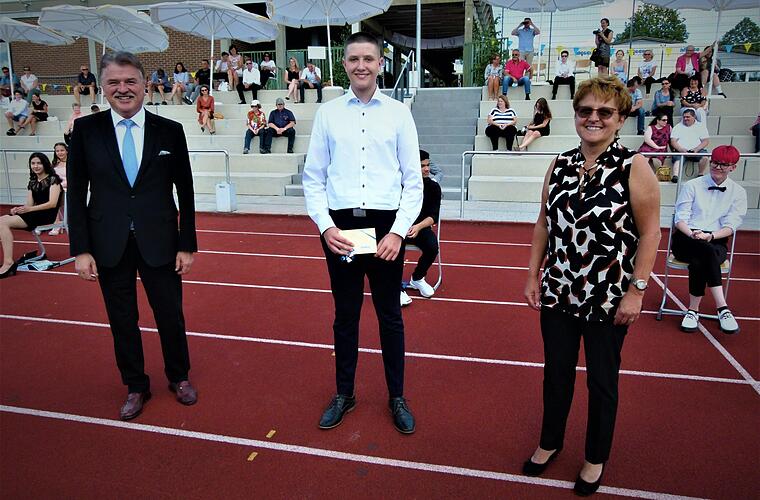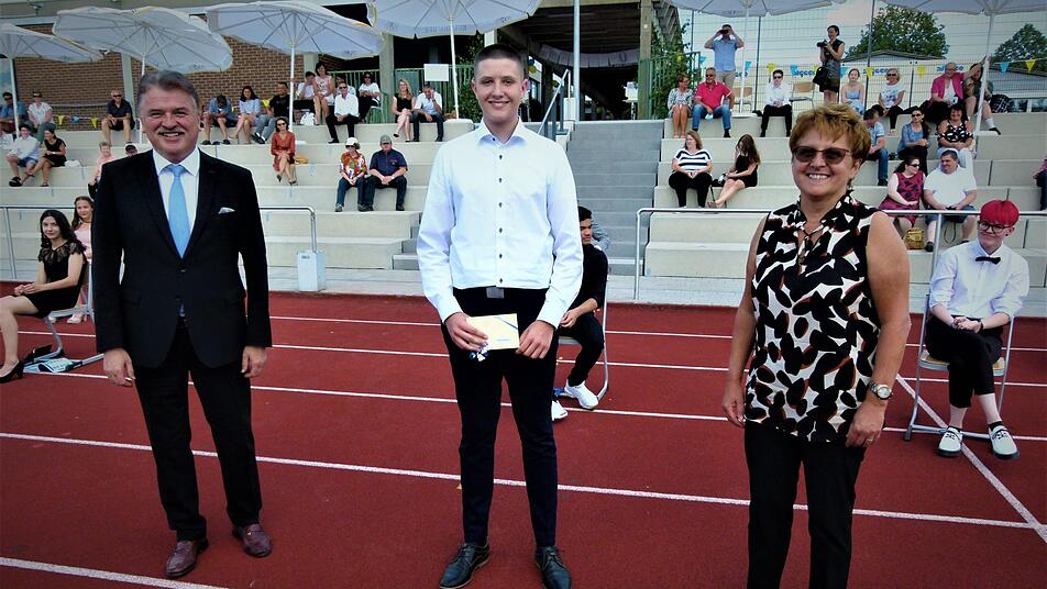 21 Schülerinnen und Schüler haben die Mittere Reife mit einer Eins vor dem Komma abgeschlossen. Mit einem Notendurchschnitt von 1,17 war der 16-jährige Kulmbacher Paul Schwabenland der Schulbeste. Ihm überreichte Landrat Klaus Peter Söllner (FW) den Landkreispreis. Schwabenland wird im September an die FOS wechseln. Er will nach dem Fachabitur in Nürnberg ein Maschinenbau-Studium aufnehmen. Der 16-Jährige, der von seinem guten Notendurchschnitt selbst ein bisschen überrascht war, stellte fest, dass nicht nur das Lernen, sondern auch die Kameradschaft wichtig waren: "Wir hatten eine gute Klassengemeinschaft und viel Spaß miteinander."