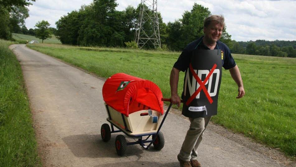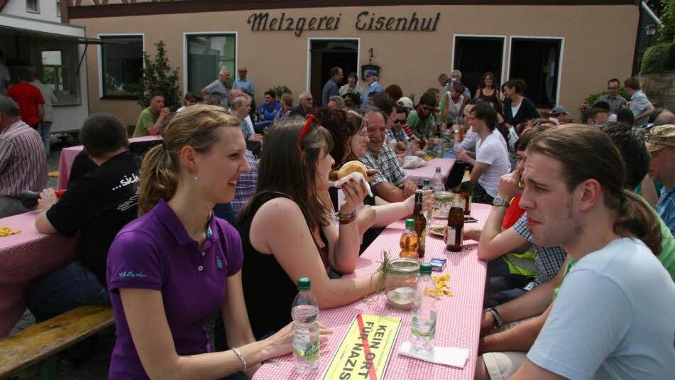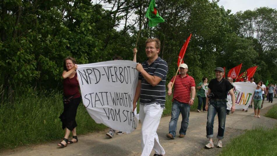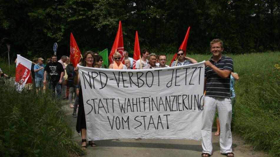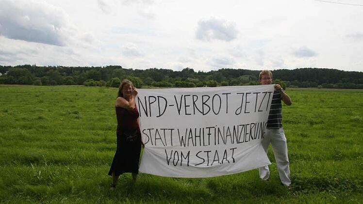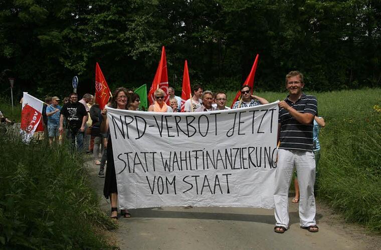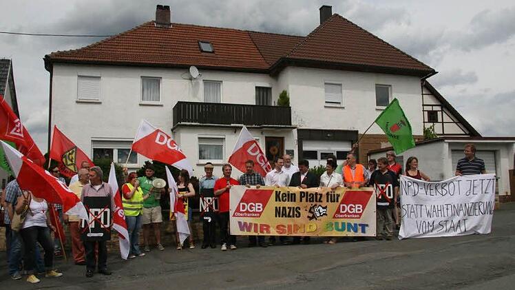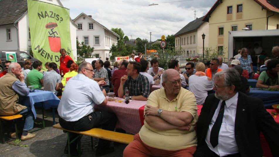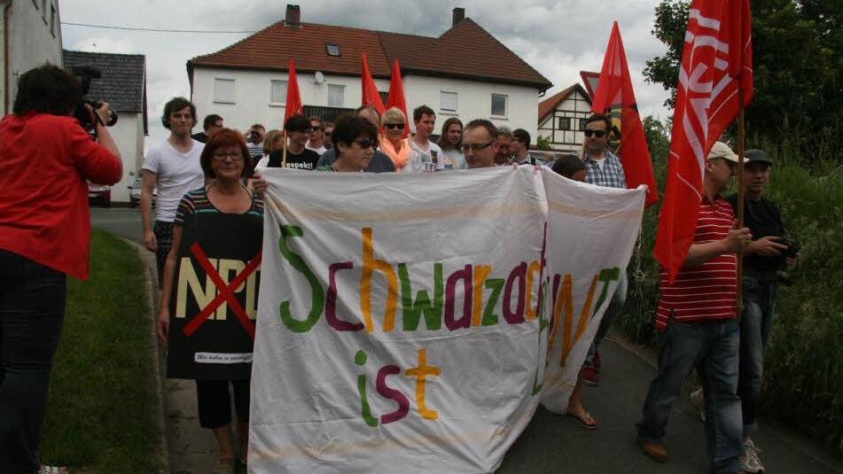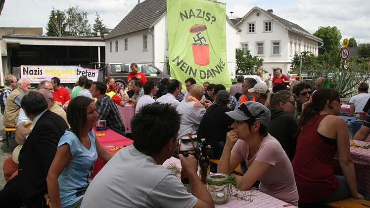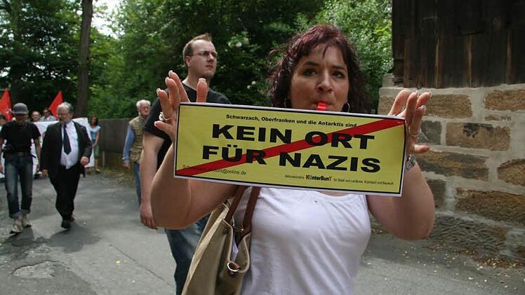 Rund 60 Demonstranten haben in Schwarzach (Kreis Kulmbach) den Punktsieg bei der Ausrichtung des NPD-Landesparteitags mit einem bunten Fest gefeiert.