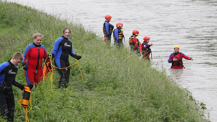Der vielleicht spektakulärste Abschnitt der praktischen Ausbildung erfolgt dann am Samstagnachmittag. Vom Schwimmbad-Wehr aus wälzen sich braune Wassermassen durch die Flutmulde. Wer hier in den Sog der Strömung gerät, muss ein trainierter Schwimmer sein, um aus eigener Kraft wieder freizukommen.