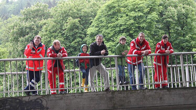 der Hand halten. Zur Eigensicherung wird die Leine etliche Male ums Brückengeländer geschlungen - im Ernstfall sollten sich die Helfer nicht selbst in Gefahr bringen.