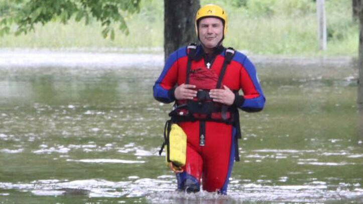 Auf der Straße nach Ebersbach steht das Wasser knietief. Vorbeitreibende Äste zeigen an, dass die Strömung stark ist. Ein Quadfahrer wagt sich ein paar Meter vor, dann dreht er wieder um: Fahrzeuge kommen da nicht mehr durch. Auch der Rettungswagen nicht. Ein Fall für die Wasserretter.