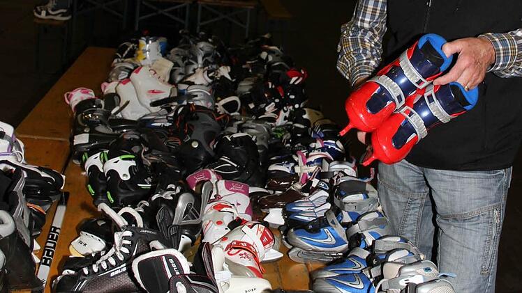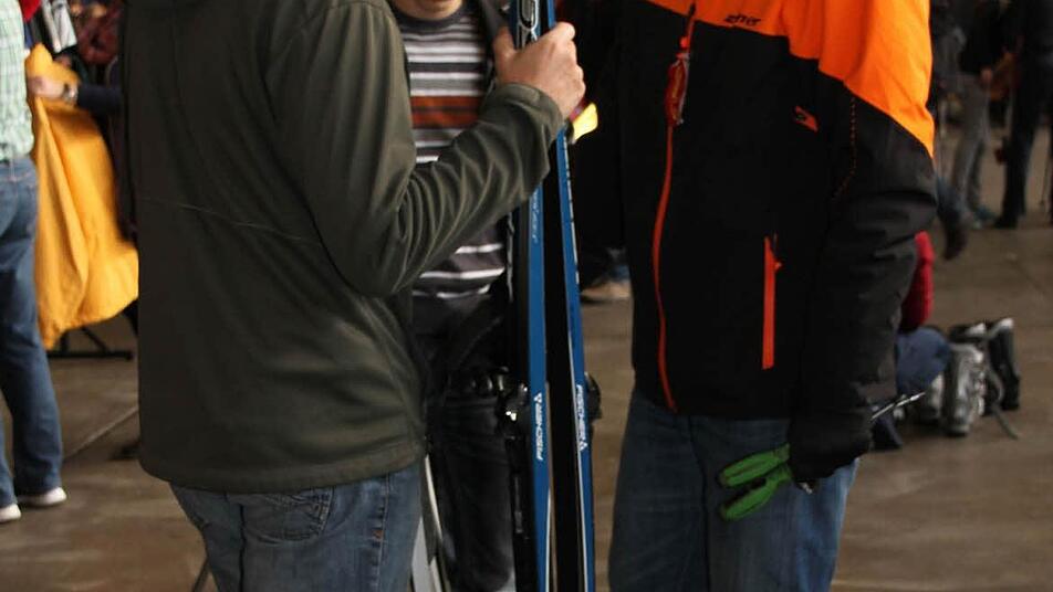 Eigentlich hat jeder gut erhaltene Skisachen abzugeben. Hunderte Menschen bevölkern bereits am Samstag die Mönchshofshallen. Und die Helfer, die nicht damit beschäftigt sind, Nummern auszugeben und die Dinge zu etikettieren, "räumen ein". "Wir sortieren die Skischuhe nach Größe", erklärt Motschenbacher. Doch nur nach der Größe kann man nicht gehen. "Es gibt harte und weichere Skischuhe. Manche fühlen sich in harten unwohl", sagt Ulli Wagner und berät einige, die ihre Schuhe abgeben. Und auf Anhieb erkennt der Skisportler, ob die Schuhe eher schmal oder eng geschnitten sind - Größe hin oder her. Wagner ist seit vielen Jahren bei der Skibörse dabei - und ein passionierter Skifahrer.