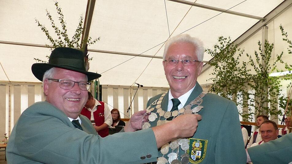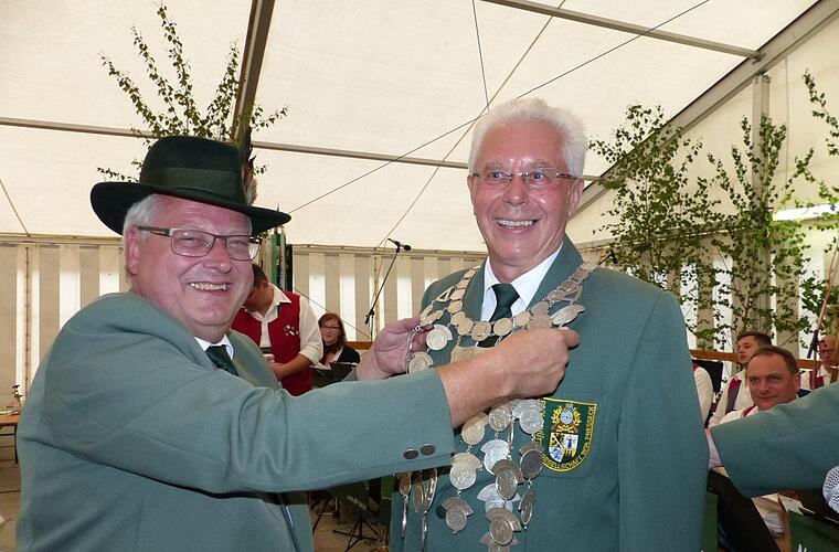 Roland Seiferth aus Heinersreuth regiert für ein Jahr das Pressecker Schützenvolk. Bei der Königskrönung am Montagabend durfte Schützenkommissar Stefan Sigmund den Heinersreuther, der erst im Vorjahr in die Schützengesellschaft Presseck eingetreten war, erstmals mit der Hauptkönigskette schmücken.