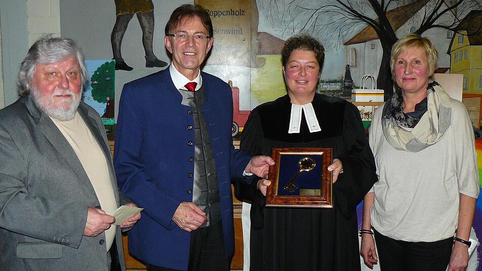 Architekt Hans Spindler übergab symbolisch den Schlüssel der neuerbauten Kinderkrippe an Rugendorfs Bürgermeister Martin Weiß, der ihn unverzüglich an Pfarrerin Kathrin Klinger als Vertreterin des Trägers, der Evangelischen Kirchengemeinde Rugendorf, weiterreichte. Zusammen mit ihrer Leiterin Waltraud Bauer und Erzieherinnen zogen die Kleinen singend als Festmusikanten in die neue Kinderbetreuungseinrichtung ein.