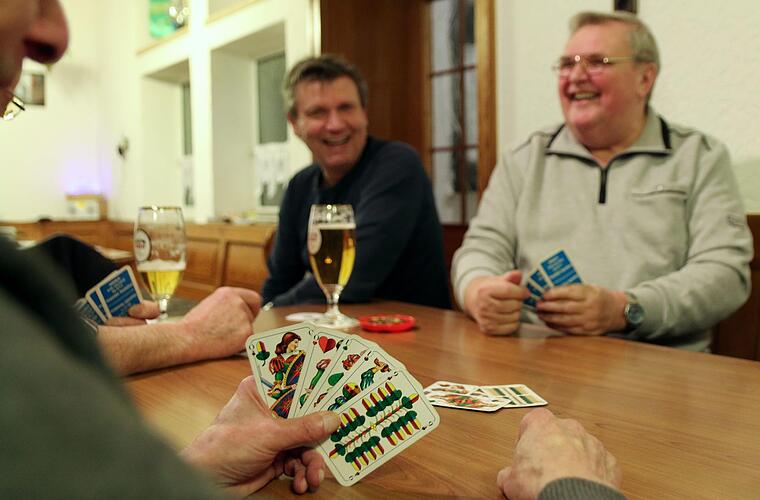 "Jedes Spiel ist anders. Schafkopf hält das Hirn fit", schwärmt Günther Bergmann. Egal ob Wenz, Geier, Farbsolo oder Rufspiel - bei jeder Runde muss man sich konzentrieren und sich die bereits gespielten Karten merken. Kein Wunder also, dass beim Kartenspieler-Stammtisch kaum geschwätzt wird, höchstens ab und zu ein bisschen geschimpft über ein schlechtes Blatt. Dafür haben sich die Schirradorfer "Kartler" ein Trostpflaster ausgedacht. Teilt der Geber zufällig vier 9er an einen Spieler aus - die schlechtesten Karten im Spiel - so darf dieser ein Glöckchen läuten und die Wirtin bringt eine Runde Schnaps auf Kosten des Gebers. Das Konzept bewährt sich bereits seit 40 Jahren. Die Schirradorfer "Kartler" freuen sich auf viele weitere gesellige Abende mit ihrem Lieblingsspiel. "Solange ich strampeln kann, spiele ich Schafkopf", sagt der 76 Jahre alte Günther Bergmann mit Nachdruck.