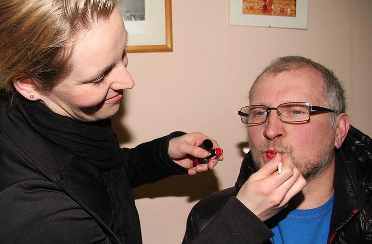 Sieben Frauen tun ihr Bestes, um die Männer bühnenfertig zu machen. Kein leichtes Unterfangen. "Wir müssen verschiedene Sachen ausprobieren. Man muss einfach sehen, wie das Make-up wirkt", erklärt Waltraud Kellermann. Und nicht nur aus der Nähe muss das Make-up gut aussehen, sondern es kommt auch auf die Fernwirkung an. Deshalb darf es ruhig ein bisschen kräftiger sein.