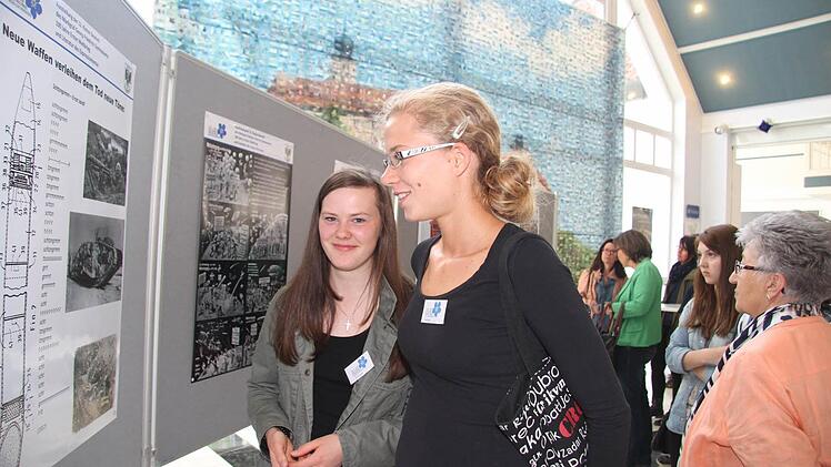 Oberstufenschüler des Markgraf-Georg-Friedrich-Gymnasiums hatten passend zur Theateraufführung "Der Letzte macht das Licht aus" zwei Ausstellungen zu den Themen Erster Weltkrieg und die Sprache des Krieges im Foyer der Stadthalle präsentiert.