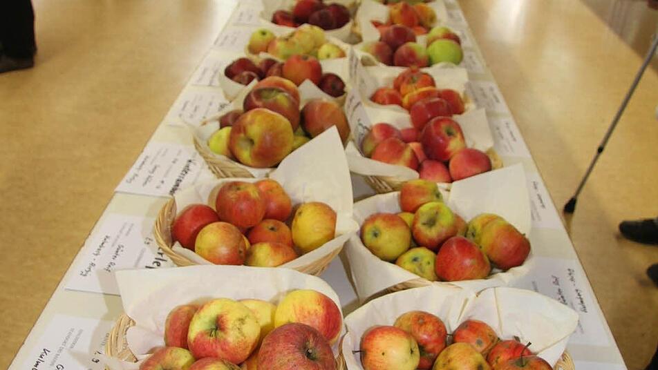 Die Mehrzweckhalle in Schwarzach war für das Großereignis in eine Festhalle für Äpfel aller Art umfunktioniert worden. Auf Tische standen 180 Körbchen, jedes einzelne gefüllt mit leckeren Äpfeln.
