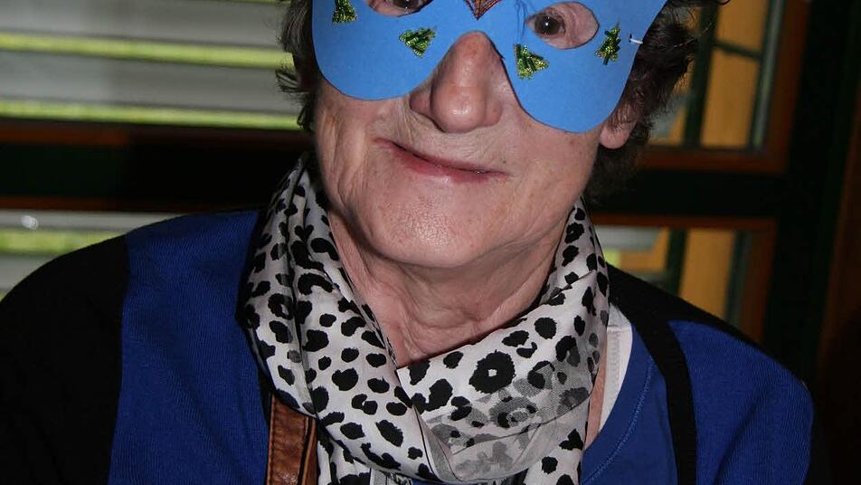 Auch ihre Tischnachbarin Friedel Graf (74) hat sich viel Mühe gemacht. "Ich habe in der Therapiegruppe gebastelt", erzählt Friedel Graf. Sie hat eine venezianische Maske auf, die sie wirklich unkenntlich machen. Die Maske harmoniert perfekt mit dem Königsblau der Bluse. Und als Krönung ist sie mit einer Pfauenfeder verziert.