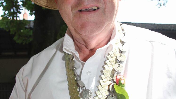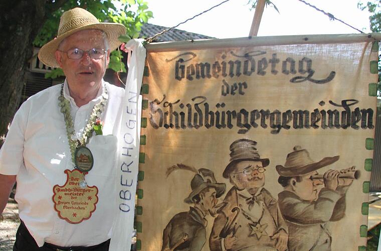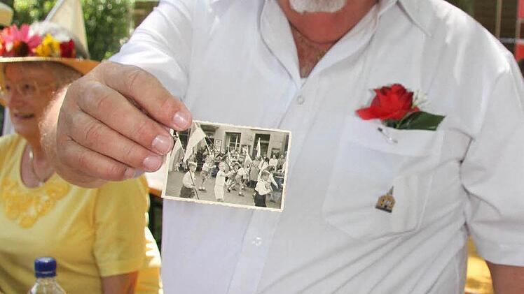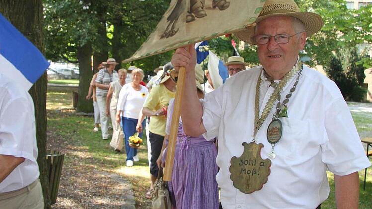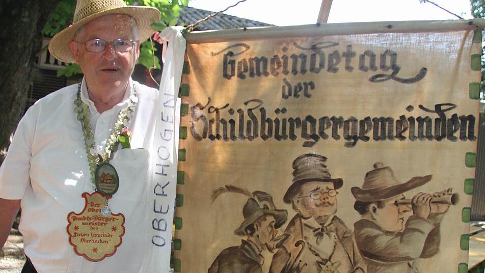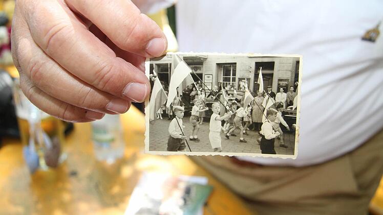 Werner Hofmann (73) hat sich für den Anlass eine stolze Bürgermeisterkette umgelegt mit der Aufschrift "Freie Gemeinde Oberhacken". Doch eigentlich gibt es ja kein "K" im Fränkischen, deshalb steht auf seiner prächtigen Fahne auch "Oberhogn". Früher freuten sich die Kinder noch darüber, dass es zur Feier des Tages eine Bratwurst gab, erzählt er. "Ich war immer dabei - sieben Jahre lang war ich im Oberen Schulhaus", erzählt Hofmann. Heinz-Georg Schaller hat die Original-Fahne seiner Schulzeit vom Dachboden herunterholt und auch eine alte Schwarz-Weiß-Aufnahme dabei, auf der er als Schuljunge diese Fahne schwenkt.