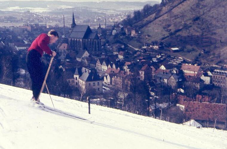 Hochlaufen und Skier tragen Selbst ein begeisterter Skifahrer, hält Seyferth seinen geliebten Wintersport, den er bis ins hohe Alter betrieben hat, im Bild fest und überliefert beeindruckende Fotos. Grandios die Aufnahme vom schneebedeckten (heute zugewachsenen) Rehberghang und dem Skifahrer, dem die Kulmbacher Altstadt zu Füßen liegt. Dort lernen in den fünfziger und sechziger Jahren die Kulmbacher Kinder das Skifahren - oder am Leithen-Hang bei Tennach, wo man anschließend zünftig und topmodisch gekleidet im "Waldschlösschen" einkehrt. Für heutige Skifahrer kaum vorstellbar, dass man den Hang selber hochlaufen und die Skier hochtragen muss.