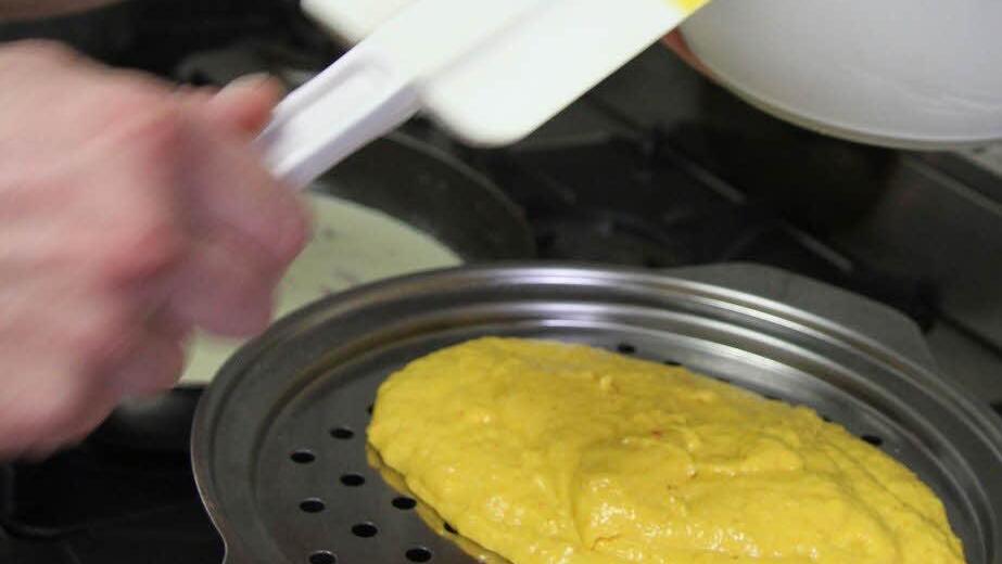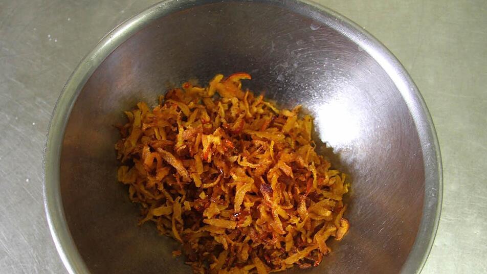 Mit einem herkömmlichen Kochlöffel schlägt sie 400 Gramm Kürbis mit zwei Eiern und etwa sieben Löffeln Mehl schaumig. Damit die Spätzle einen schönen Biss haben, mischt sie noch zwei Esslöffel Hartweizengrieß unter. "Man muss den Teig so lange schlagen, bis er Blasen schlägt. Dann ist er richtig", verrät Susanne Linardi. Unterdessen frittiert sie ein Schälchen geriebenen Kürbis - als Garnitur. Und sie brät Bauchscheiben kross an - ebenfalls als Garnitur.