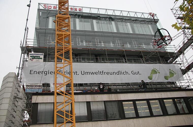 "Nachhaltig plus" bezieht sich auf die gewaltigen Energiekosten. Und deshalb setzte die Sparkasse auf ein technisch ausgefeiltes Wärme- und Lüftungskonzept sowie eine architektonisch außergewöhnliche Fassadengestaltung. "Und die Glashülle ist nicht nur funktional, sie ist auch mutig, offen einladend. Man schaut hin", freute sich Scherr über die ersten Eindrücke, die die Glashaut vermittelt.