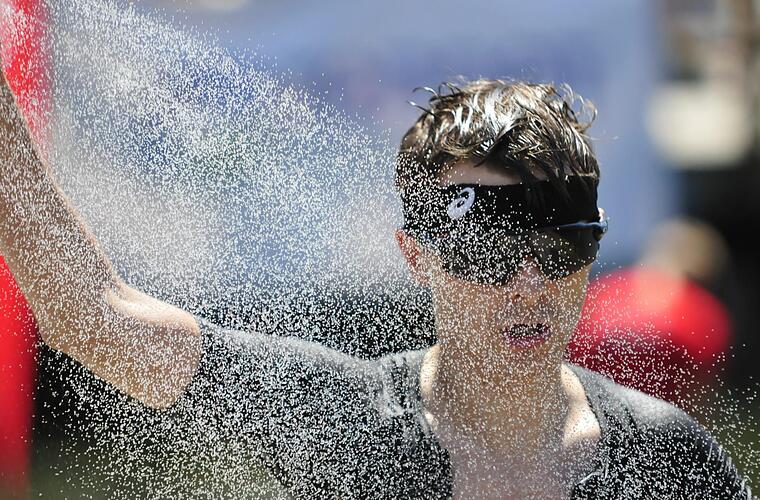 Die problematischste Teilstrecke war aufgrund der Hitze natürlich die Laufrunde um den Badesee. Die zusätzlich gereichten Wasserschwämme und Duschen wurden dankbar angenommen. Nicht nur hier waren die vielen Helfer gefragt und ermöglichten den Athleten einen fairen Wettkampf.