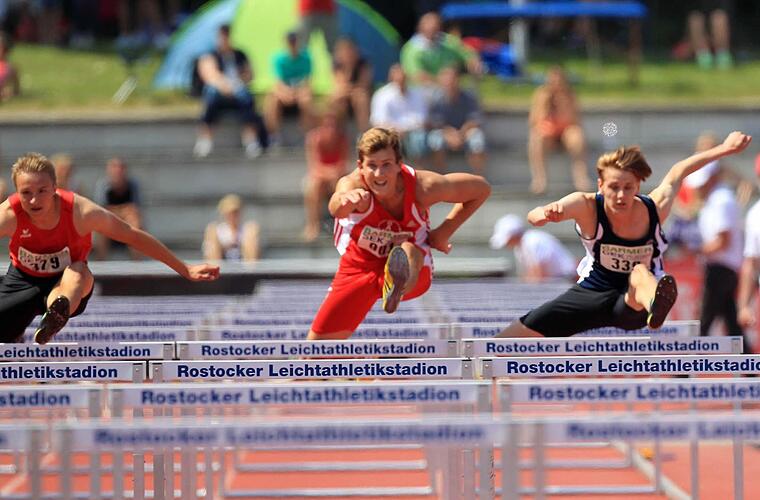 In Rostock sind alle happy: Julian Hoffmann, Hürdensprinter des ATS Kulmbach, Gabi Hoffmann, seine Trainerin, und Andreas Knauer, Landestrainer der U 20 in Bayern. Der 18-jährige Leichtathlet präsentiert sich bei der deutschen Meisterschaft der Junioren in Topform. Er wird Siebter über 110 Meter Hürden, seine 14,48 Sekunden zum Saisonhöhepunkt sind eine Leistungs explosion. "Damit hatte ich keinesfalls gerechnet", zeigt sich Julian hinterher selbst überrascht.