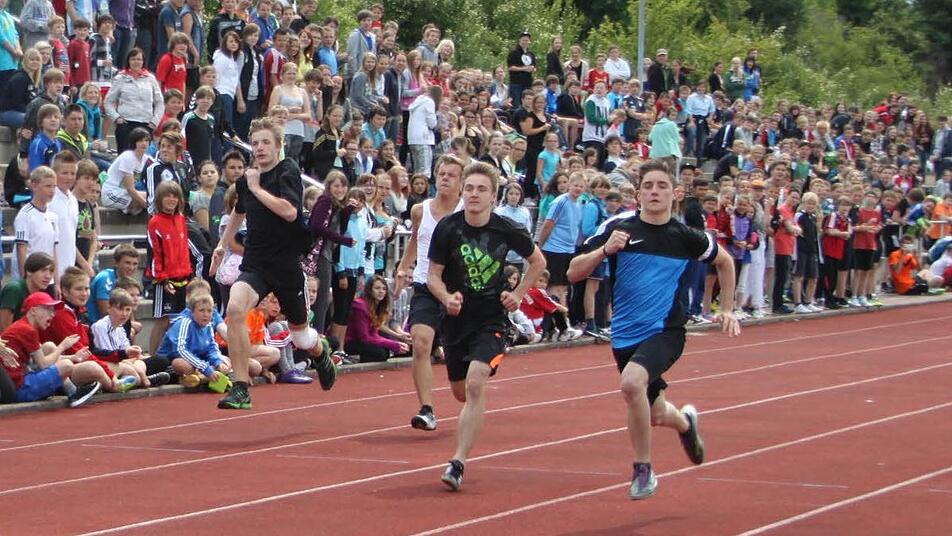 Knapp war es, aber die Carl-von-Linde-Realschule hat wieder einen 11-Sekunden-Sprinter: Es herrschte Sportfestatmosphäre, als amDonnerstag zum Abschluss der Bundesjugendspiele die besten Sprinter der Schule über 100 Meter antraten. Angefeuert von den Zuschauern, setzte sich vor vollbesetzten Rängen Nikolai Masel (rechts/Klasse 9d) mit 11,9 Sekunden durch. Die Plätze belegten Stefan Luthard (12,2/9b) und Markus Ritschel (12,5/9a). Schnellstes Mädchen war Sarah Pöhnel (8a) mit 12,7 Sekunden, die im B-Lauf einige Buben hinter sich ließ.