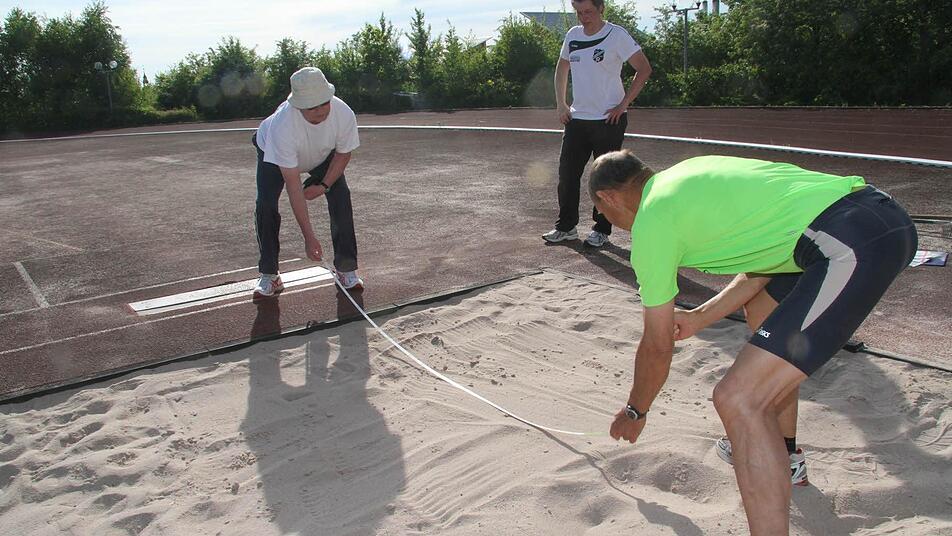Standweitsprung Melanie Türk hat aus dem Bereich Kraft die Disziplin Standweitsprung gewählt. Sie muss für Bronze 1,35 Meter springen. Peter Schmitz kommt trotz seiner 72 Jahre auf Anhieb auf 1,80 Meter. "Das sieht leicht aus", sagt Melanie Türk. Doch ihr erster Sprung zeigt: Ganz so einfach ist es nicht. Gisela Seehuber schaltet sich ein. "Man muss mit den Armen schwingen. Ich schwinge immer ein Mal, beim zweiten Mal springe ich", rät die 73-Jährige. Seehuber hat 40 Mal das Sportabzeichen gemacht. In Gold! Auch 2015 will sie ihre Fitness testen.
