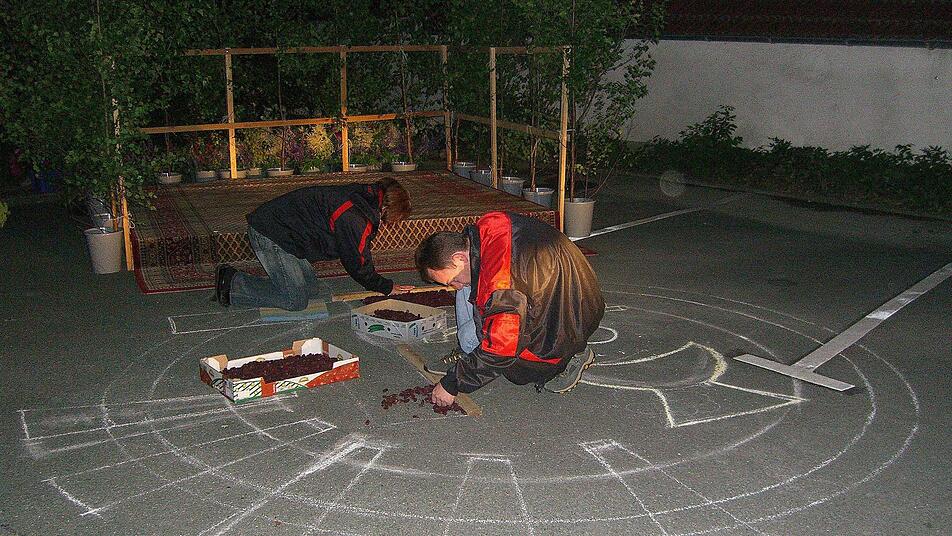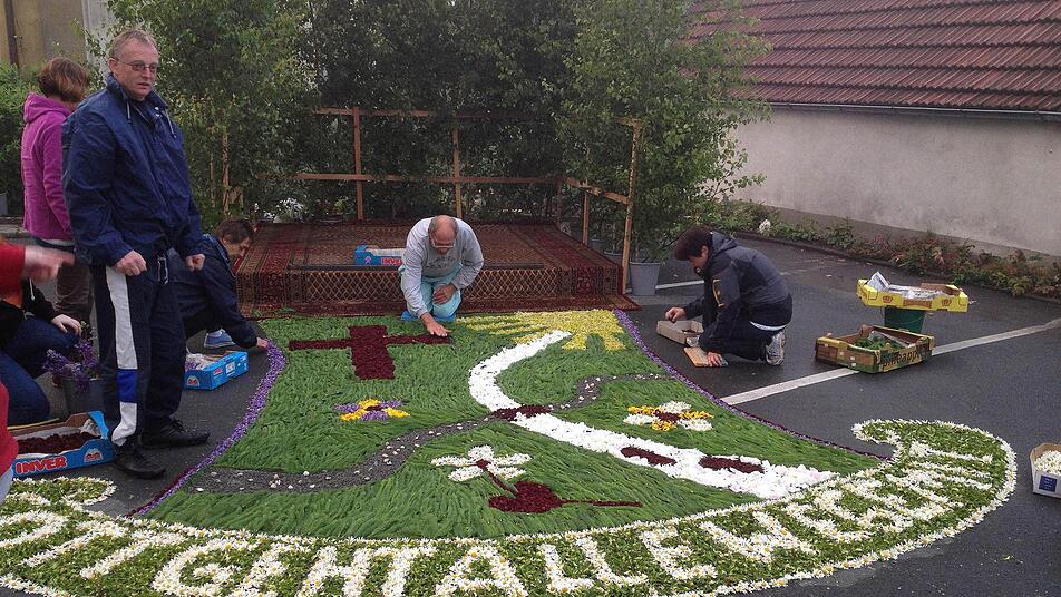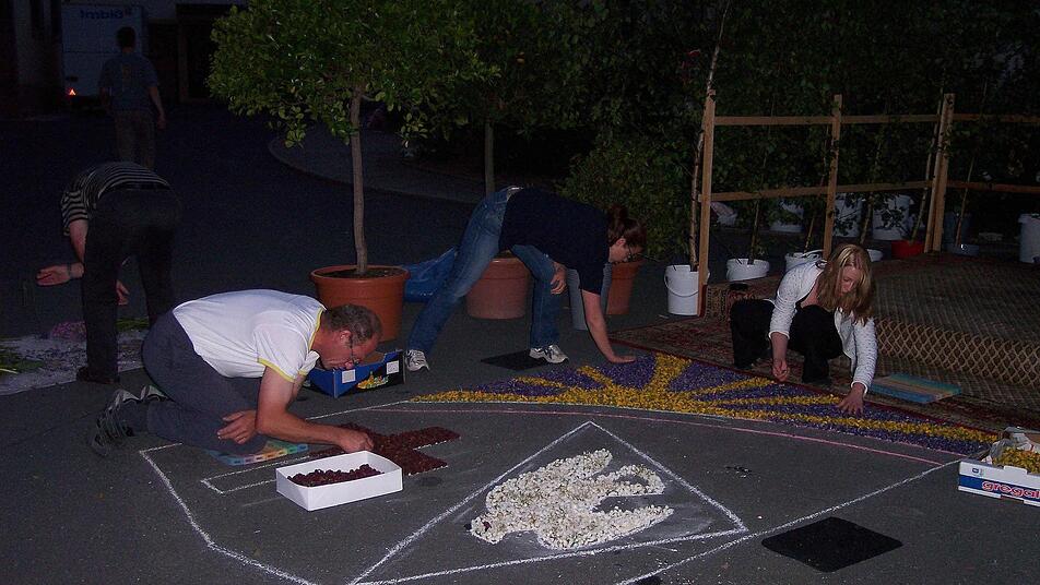 Nachruhe vor dem Fest ist für die ehrenamtlichen Helfer der Feuerwehr nicht angesagt. Denn schon morgens zwischen 3 und 4 Uhr beginnen sie mit ihrer Arbeit, sonst wird der Teppich nicht fertig. "Unser schlimmster Feind ist der Wind", weiß Vorsitzender Hans-Jürgen Hempfling. Mitten in der Nacht wird mit Kreide das Motiv aufgezeichnet - die Kreise müssen schön rund werden. "Die bringen uns nicht mehr aus der Ruhe", sagt Reinhardt Titze. Wenn das Motiv samt Schriftzug steht, beginnt das Legen. Akkurat. Alle Blüten und Zweiglein in einer Richtung. Mit Taschenlampen und im Scheinwerferlicht der Autos gehen die Teppich-Experten zu Werke. "Wenn es windig ist, besprühen wir die Blumen mit Wasser, damit sie am Boden kleben bleiben", kennt Titze ein paar Tricks und hofft, dass die Gläubigen sich an dem Blumenteppich auch in diesem Jahr wieder erfreuen.