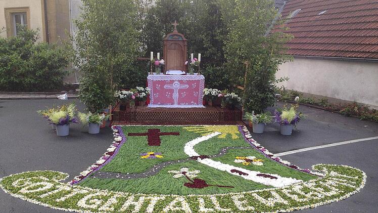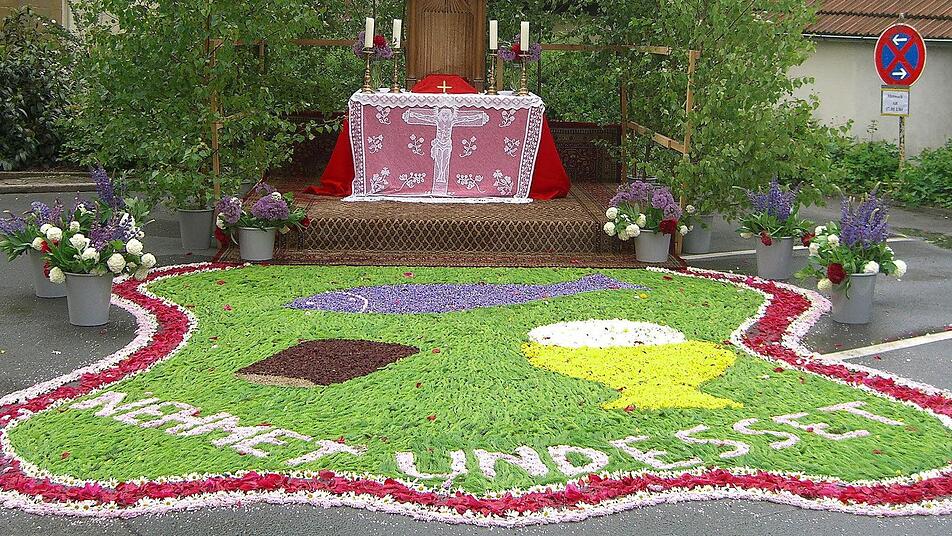 Das beste Beispiel ist Reinhardt Titze von der Feuerwehr. Er konzipiert seit Jahren mit seiner Frau Gabriele den Blumenteppich. Er ist evangelisch und für die Reinzeichnungen zuständig, seine Frau, eine echte Katholikin aus Hohenberg, hat die Ideen und denkt sich die Motive aus. "Das ist heuer der elfte Teppich, den wir legen. Schon kurz nach Weihnachten mache ich mir darüber Gedanken", verrät sie.
