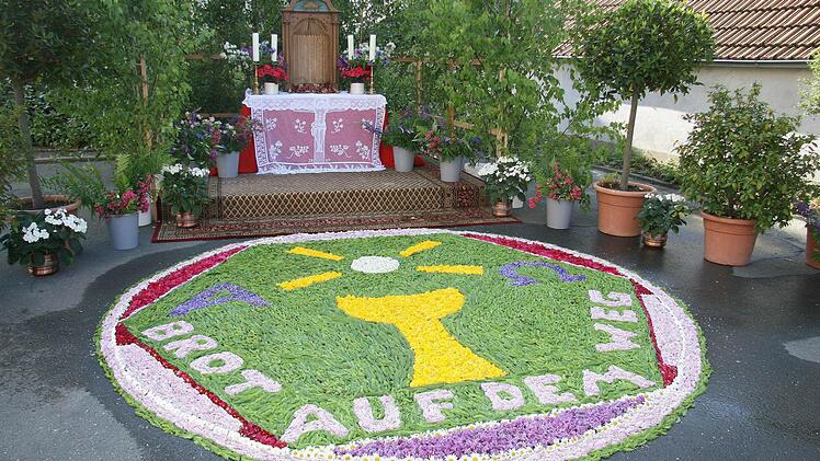 Am Donnerstag soll der Blumenteppich auf dem Kirchplatz eine Blume darstellen. Allein die Blüte soll 3,50 Meter Durchmesser haben. Darin wird aus gelbem Mauerpfeffer eine Sonne abgebildet. Aus bunten Blüten soll ein Regenbogen entstehen. Und auch ein Kreuz und ein Baum sind vorgesehen. "Gelben Mauerpfeffer finden wir. Wir haben schon geschaut, wo er wächst", erklärt Gabriele Titze. Auch für die weißen Blumen, von denen wegen des kalten Wetters viele noch nicht blühen, muss Mauerpfeffer herhalten.
