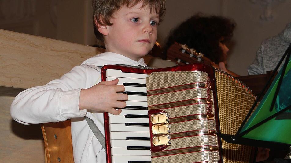 Doch auch all diejenigen, die sich zum ersten Mal auf die Bühne trauten, machten ihre Sache prima. Jonas Hagen ist erst sechs Jahre alt. Er wagte sich ganz allein auf das Podest und spielte dann mit einem verzückten Lächeln "A, a, a - der Winter, der ist da!". Dass er zugleich der einzige Akkordeonspieler beim ganzen Konzert war, genoss der kleine Künstler richtig.